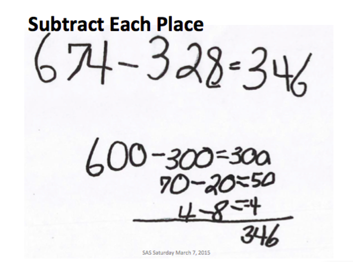 When students develop strong number sense, and use numbers flexibly, they could come up with other strategies like “subtracting by place.” It is ideal to allow this strategy to organically emerge from one of the students, instead of teaching it. When they use their own words to explain a new strategy, it suddenly makes sense.