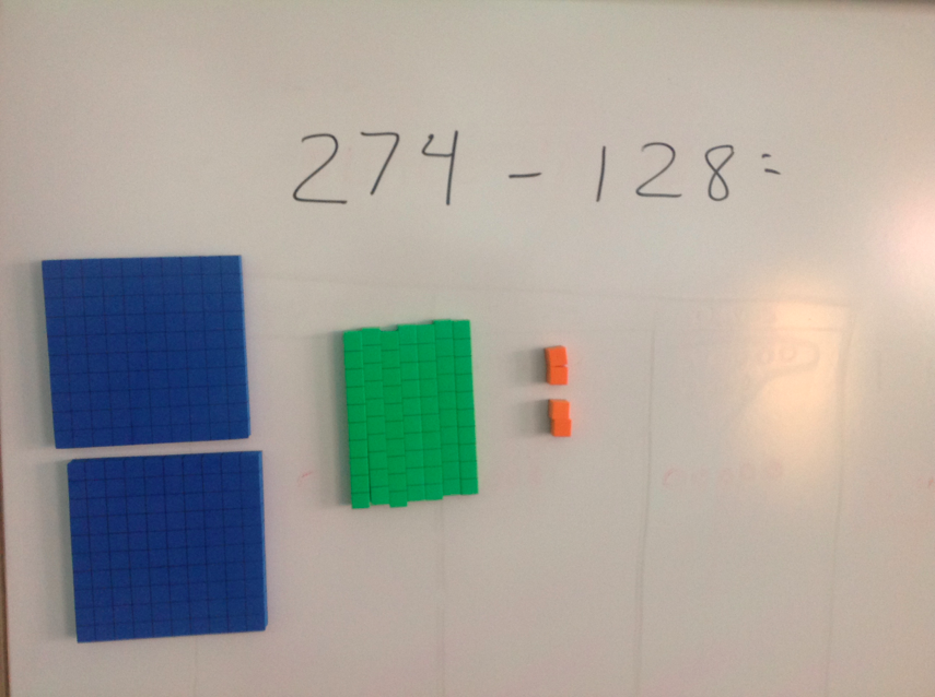 When students can use concrete manipulatives, like these base ten blocks, they can make sense of what “take-away” looks like. For instance, when taking away 128 from 274, students will start by taking away the hundreds, to then take away the tens.